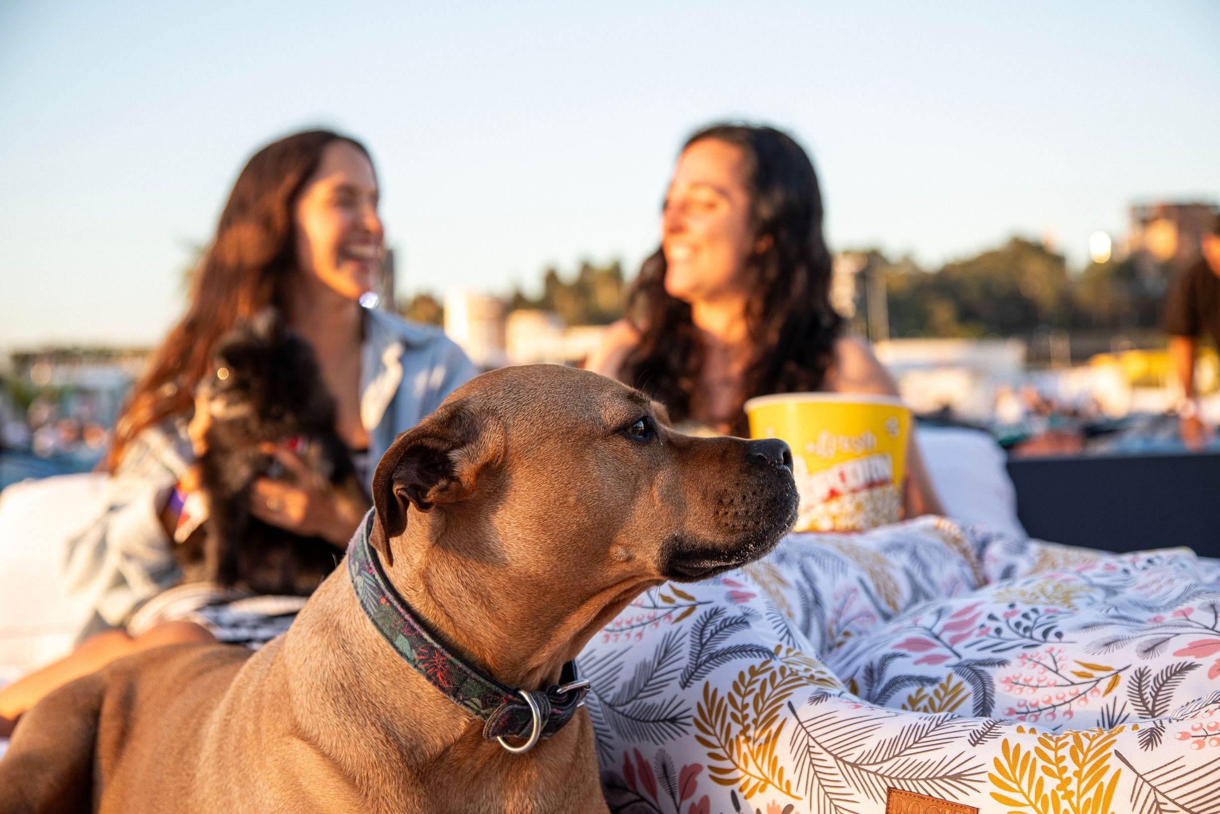Friends cosying up with a snack at the Mov'in Bed outdoor cinema in Barangaroo with their pooch pals.